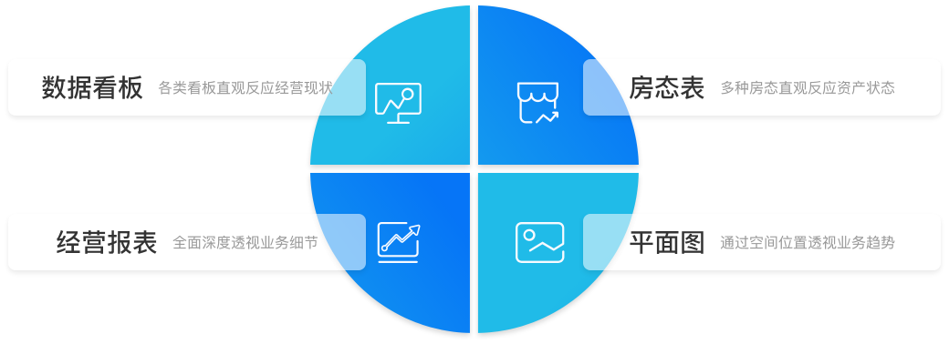 系统提供指标看板、实收看板、业务预警看板、收费状态看板、租赁价